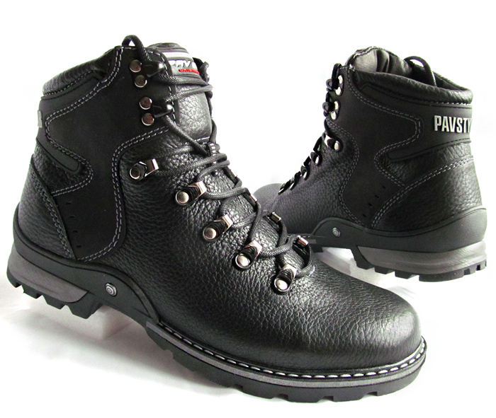 Ботинки мужские высокие зимние, чёрного цвета из кожи, обработанной тиснением под оленя, с чёрными вставками-накладками из гладкой кожи по бокам (фото 2 и 3); полностью из натуральной кожи с густым натуральным мехом овчины внутри. Подошва утолщённая из пористого полиуретана (не промерзает и не скользит), приклеена методом "горячей вулканизации", укреплена прошивным рантом по периметру переда и задника, не пропускает влагу; задник имеет дополнительную накладку от влаги. Ботинки очень выносливые, хорошо и надёжно защищают ногу от промерзания и любых грубых повреждений. Такие ботинки можно одевать в строй!