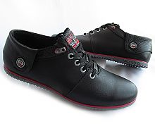 Полуботинки спортивного стиля мужские, типа лёгких кроссовок (комфорт), полностью из мягкой натуральной овечьей кожи чёрного цвета. Модель этого года, перёд туфля цельнокроеный, с выстрачкой и шнурками, а также, модной в этом году, красной отделкой , фурнитурой и рантом. Подошва - из термо-каучука лёгкой структуры с красным рантом. Подходят под джинсы или брюки чёрного и других цветовых оттенков; можно одевать также под красные и белые джинсы.