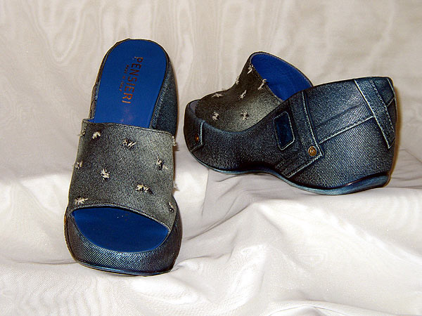 Шлёпанцы жен.,внутри-натур. кожа,верх покрыт джинсом,лёгкая танкетка из плотного пористого полиуретана, высота в каблуч. части -10см, но за счёт платформы фактически высота не более 5см. Идут на размер меньше.Платформа удобная и лёгкая. (На подошве написано 40/41, "идут" на 40 р. ноги ). (Италия).