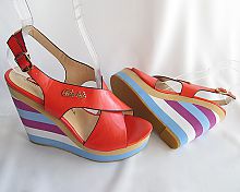 Босоножки женские летние, верх - из пресс-кожи, очень похожей на натуральную,- не каждый отличит разницу, ярко-оранжевого увета; на лёгкой удобной танкетке высотой в под-носочной части - 3см, а в каблучной -11см, что в итоге (11-3) = 8см. Колодка очень удобная и не ощущается высота из-за её лёгкости и устойчивости. Подходят под любую летнюю одежду : белого , голубого, сиреневого, бежевого, жёлтого цвета и всех оттенков оранжево-красных .